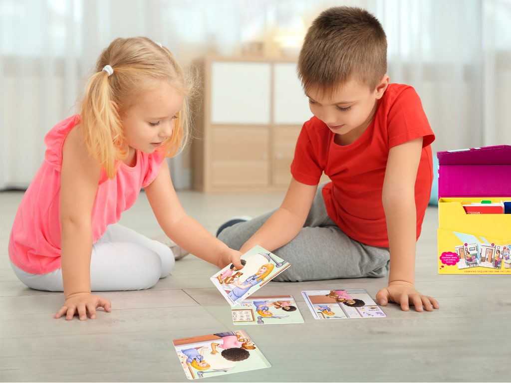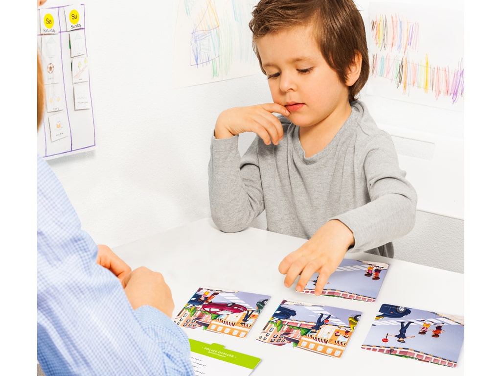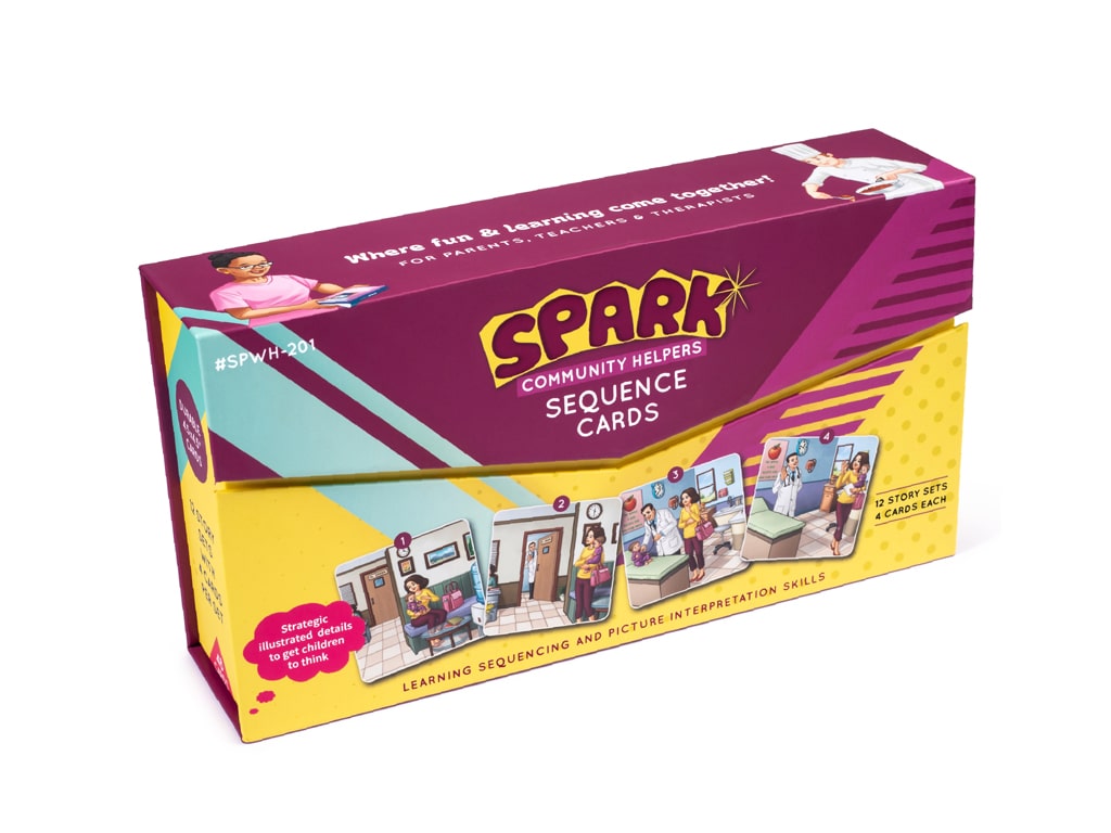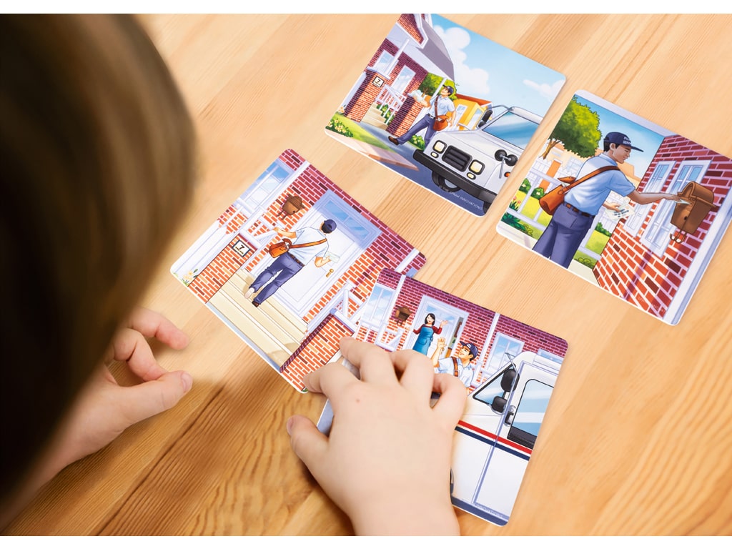 Οι κάρτες με αλληλουχίες είναι ένα εκπαιδευτικό παιχνίδι που περιλαμβάνει εικονογραφημένες κάρτες με ιστορίες σχετικές με επαγγέλματα της κοινότητας όπως γιατρούς, πυροσβέστες και άλλους επαγγελματίες. Σκοπός του είναι να βοηθήσει τα παιδιά να κατανοήσουν τη σειρά των γεγονότων να εξασκηθούν στον προφορικό λόγο και να ενισχύσουν τη λογική και παρατηρητικότητά τους. Το παιχνίδι παίζεται πολύ απλά, επιλέγεται ένα σετ με τέσσερις κάρτες που δείχνουν μια ιστορία οι κάρτες ανακατεύονται και δίνονται στο παιδί το οποίο καλείται να τις παρατηρήσει προσεκτικά και να τις τοποθετήσει στη σωστή χρονική σειρά στη συνέχεια το παιδί περιγράφει με λόγια τι βλέπει σε κάθε εικόνα και προσπαθεί να εξηγήσει τι συνέβη στην αρχή στη μέση και στο τέλος της ιστορίας. Είναι ιδανικό για παιδιά προσχολικής και πρώτης σχολικής ηλικίας και μπορεί να χρησιμοποιηθεί στο σπίτι στο σχολείο ή σε συνεδρίες λογοθεραπείας.