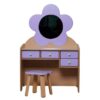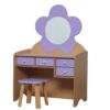 Κατασκευασμένο από συνθετικό ξύλο M.D.F. με επένδυση οξιάς, λουστραρισμένη στο φυσικό χρώμα του ξύλου, με χρωματιστές λεπτομέρειες. Φέρει τέσσερα συρταράκια, ράφι, και καθρέφτη άθραυστο ασφαλείας σε σχήμα μαργαρίτα . Όλα του τα άκρα είναι στρογγυλεμένα και ακίνδυνα για τα παιδιά. Περιλαμβάνεται και ένα σκαμπουδάκι από φουρνιστή οξιά και πλακάζ. Τα χρώματα και τα βερνίκια που χρησιμοποιούνται είναι νερού, μη τοξικά και φιλικά προς το περιβάλλον.