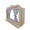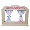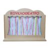 Κατασκευασμένο από συνθετικό ξύλο M.D.F. με επένδυση οξιάς, λουστραρισμένο στο φυσικό χρώμα του ξύλου με χρωματιστή διακόσμηση. Στο μπροστινό μέρος το οποίο είναι κυματιστό, έχει χαραγμένο τη λέξη «ΚΟΥΚΛΟΘΕΑΤΡΟ», χαραγμένο σε ηλεκτρονικό μηχάνημα ακριβείας και βαμμένα με ζωηρά χρώματα. Όλα του τα άκρα είναι στρογγυλεμένα και ακίνδυνα για τα νήπια. Τα χρώματα και τα βερνίκια που χρησιμοποιούνται είναι νερού, μη τοξικά και φιλικά προς το περιβάλλον.