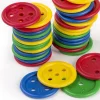 Κουμπιά ταξινόμησης σε πλαστικό βάζο. Μεγάλα κουμπιά με 1 – 5 τρύπες και ζωηρά χρώματα. Το σετ περιλαμβάνει 140 κουμπιά, 10 κορδόνια του ενός μέτρου και κάρτες με ασκήσεις.