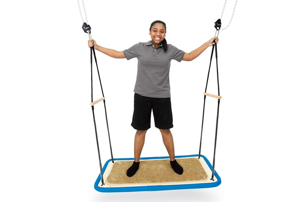 Η πλατφόρμα διαθέτει αφαιρούμενη επένδυση από μοκέτα, που στερεώνεται με Velcro® για εύκολη αφαίρεση και καθαρισμό. Το σετ περιλαμβάνει λαβές έλξης, δύο γάντζους ασφαλείας και σχοινιά ανάρτησης που κρατούν την κούνια σταθερή και επιτρέπουν ομαλή, ελεγχόμενη κίνηση, για ασφαλή χρήση και εύκολο συντονισμό των ασκήσεων