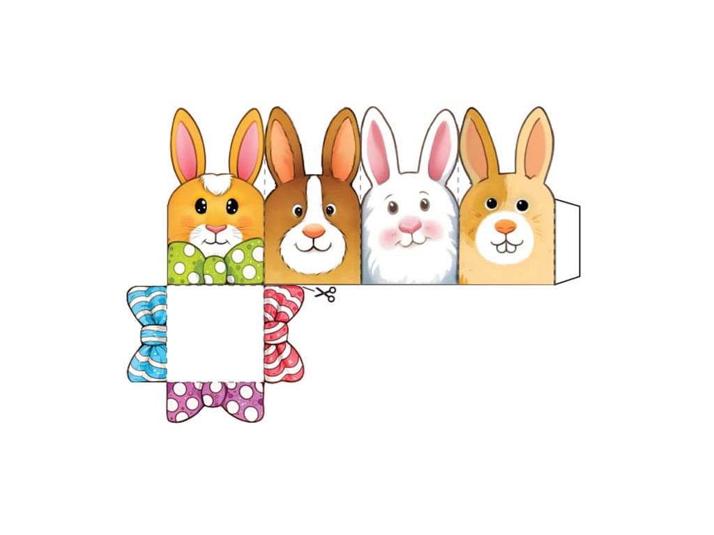 Φτιάξτε ένα χαριτωμένο χάρτινο κουτί με λαγουδάκια, ιδανικό για πασχαλινά γλυκίσματα, μικρά δώρα ή διακόσμηση. Η κατασκευή είναι απλή και διασκεδαστική, κατάλληλη για παιδιά.