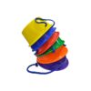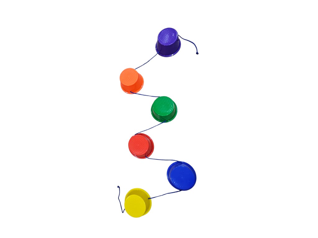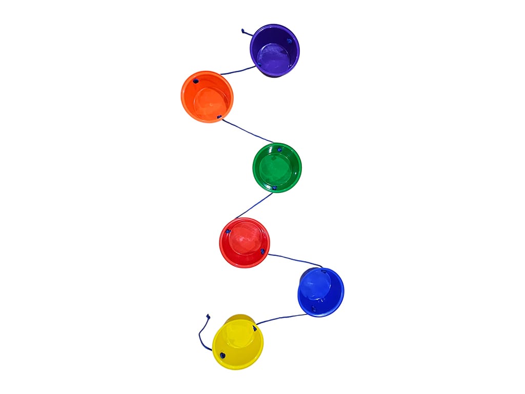 Κουβαδάκια ισορροπίας σε 6 έντονα χρώματα (κόκκινο, κίτρινο, μπλε, πράσινο, πορτοκαλί, μωβ), που συνδέονται με ένα ρυθμιζόμενο σχοινί και είναι κατασκευασμένα από πλαστικό υλικό. Θα βοηθήσουν τα παιδιά να αναπτύξουν κινητικές δεξιότητες όπως την ισορροπία και τον συντονισμού τους, ενώ διασκεδάζουν.