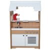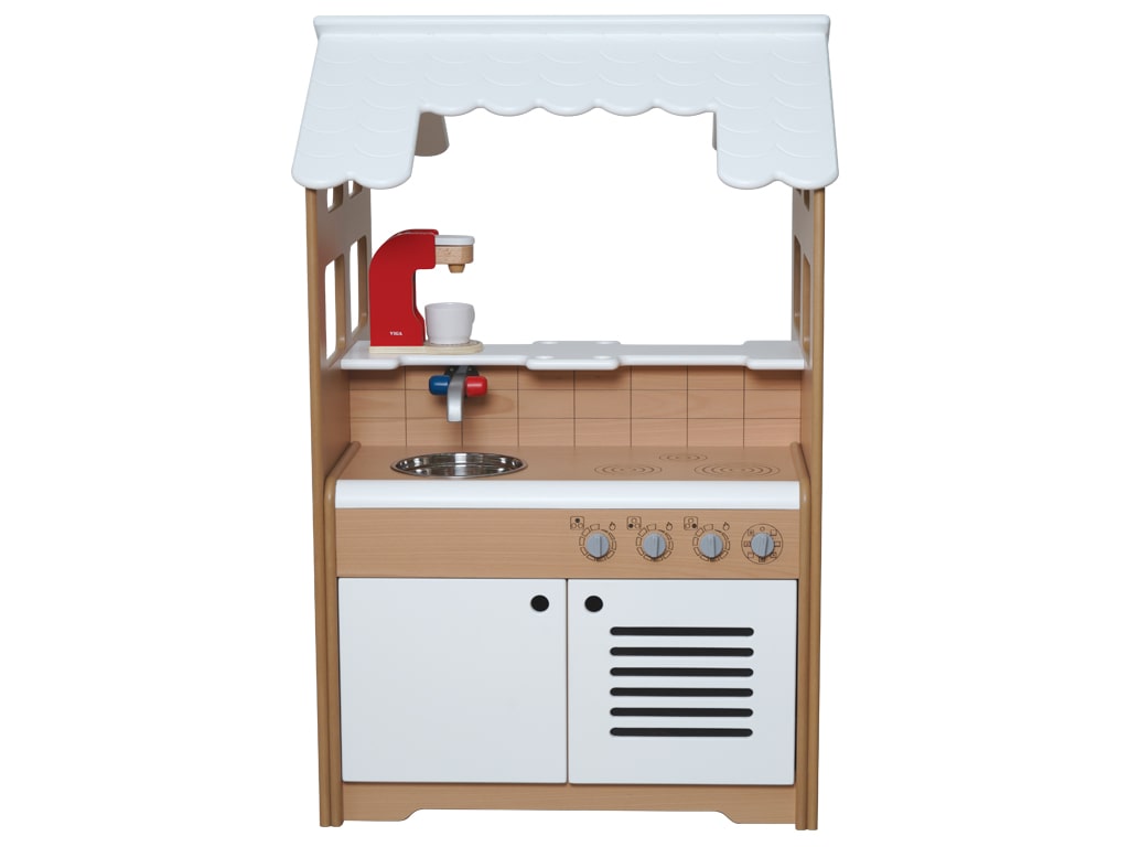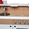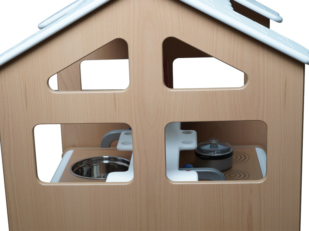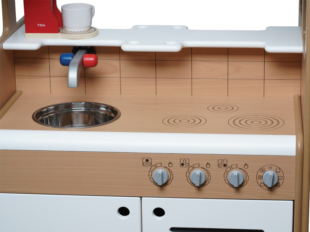 Η κουζίνα διαθέτει σε κάθε μία από τις πλευρές της, ανοξείδωτο νεροχύτη και ξύλινη βρύση, προσδίδοντας ρεαλιστικά χαρακτηριστικά στο παιχνίδι. Τα πλαστικά κουμπιά του φούρνου παράγουν ήχο “κλικ-κλακ“, κάνοντας τη χρήση πιο διαδραστική, ενώ οι εστίες στο πάνω μέρος είναι χαραγμένες με τεχνολογία laser, προσθέτοντας λεπτομέρεια χωρίς κίνδυνο για τα παιδιά. Το πορτάκι του φούρνου περιλαμβάνει διάφανο plexiglass, προσφέροντας ασφάλεια και οπτική επαφή με το εσωτερικό.