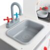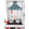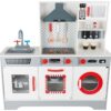 Κουζίνα ξύλινη Deluxe, εξοπλισμένη με πλυντήριο ρούχων, φούρνο, φούρνο μικροκυμάτων, ντουλάπι, νιπτήρα, απορροφητήρα, εστία, μηχανή esspreso, φλιτζάνια καφέ, μπαχαρικά και μαγειρικά σκεύη. Με περιστρεφόμενα κουμπιά και εφέ φωτός και ήχου στην εστία για ρεαλιστική μαγειρική. Στιβαρή κατασκευή από ξύλο υψηλής ποιότητας. Προάγει το ενεργό παιχνίδι ρόλων και τις κοινωνικές δεξιότητες των παιδιών. Οι μπαταρίες δεν περιλαμβάνονται. Διαστάσεις: 90 x 30 x 90 εκ. Ύψος πάγκου: 50 εκ. Ηλικία: 3 ετών και άνω.