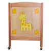 Κατασκευασμένα τα πλαϊνά από συνθετικό ξύλο MDF με επένδυση οξιάς και το υπόλοιπο από ξύλο φουρνιστής οξιάς άριστης ποιότητας, λουστραρισμένο στο φυσικό χρώμα του ξύλου με βερνίκι νερού, μη τοξικό και φιλικό προς το περιβάλλον. Οι δύο μεγάλες του πλευρές περικλείονται με καγκελάκι πεπλατυσμένο και στρογγυλεμένο σε όλες του τις πλευρές. Το καγκελάκι στη μια πλευρά του ανεβοκατεβαίνει με ασφάλεια και έχει ρυθμιζόμενο ύψος . Τα δύο πλαϊνά του (κεφαλάρια) είναι διακοσμημένα με ζωάκι (ιπποπόταμο ή καμηλοπάρδαλη) χαραγμένα από ηλεκτρονικό μηχάνημα ακριβείας CNC. Ο πάτος πάνω στον οποίο ακουμπά το στρώμα αποτελείται από ξύλινες πήχες για να αερίζεται το στρώμα (και όχι από νοβοπάν). Φέρει 4 ενισχυμένες ρόδες για την εύκολη μετακίνησή του. Όλα τα άκρα του είναι στρογγυλεμένα και ακίνδυνα για τα βρέφη. Το στρώμα δεν περιλαμβάνεται. Διαστάσεις: 136 x 68 x 88 εκατοστά