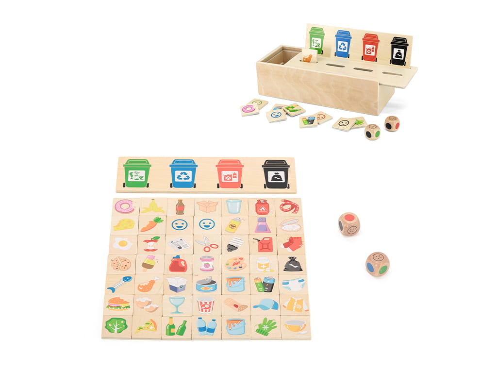 Το παιχνίδι περιλαμβάνει 4 διαφορετικές κατηγορίες απορριμμάτων, με αντίστοιχες υποδοχές στους κάδους. Στο πίσω μέρος, τα κομμάτια διαθέτουν χρώματα που αντιστοιχούν στους κάδους, επιτρέποντας στο παιδί να ελέγχει αν έχει κάνει σωστά την επιλογή. Είναι κατασκευασμένο από ασφαλή υλικά με μη τοξικά χρώματα και μελάνια, προσφέροντας ασφάλεια και ανθεκτικότητα.