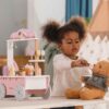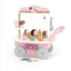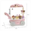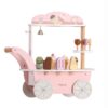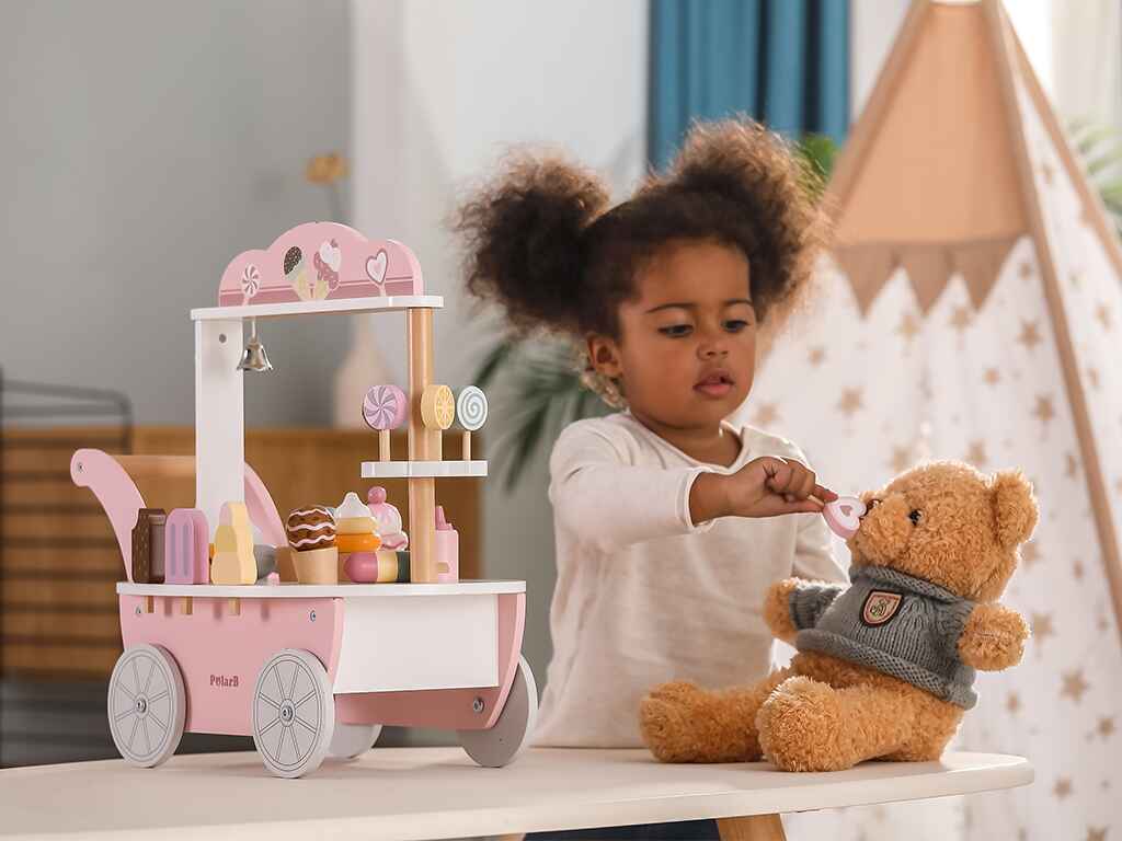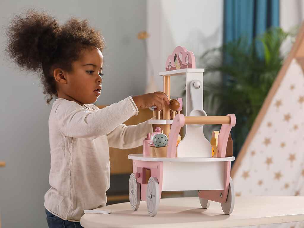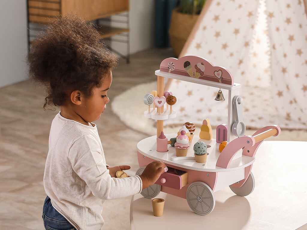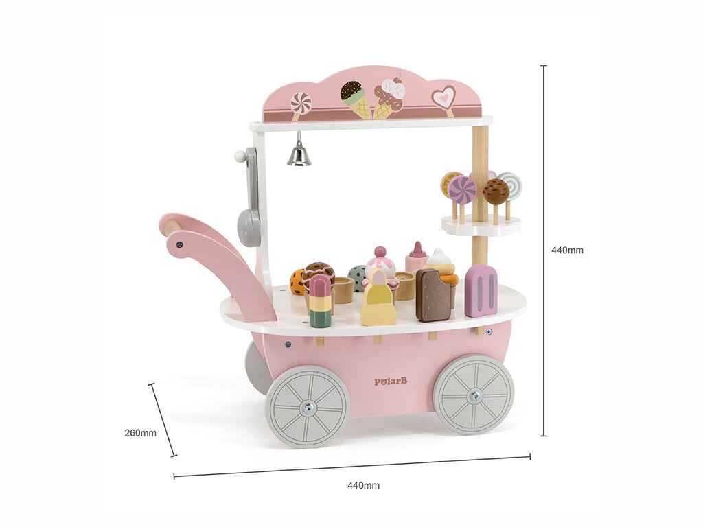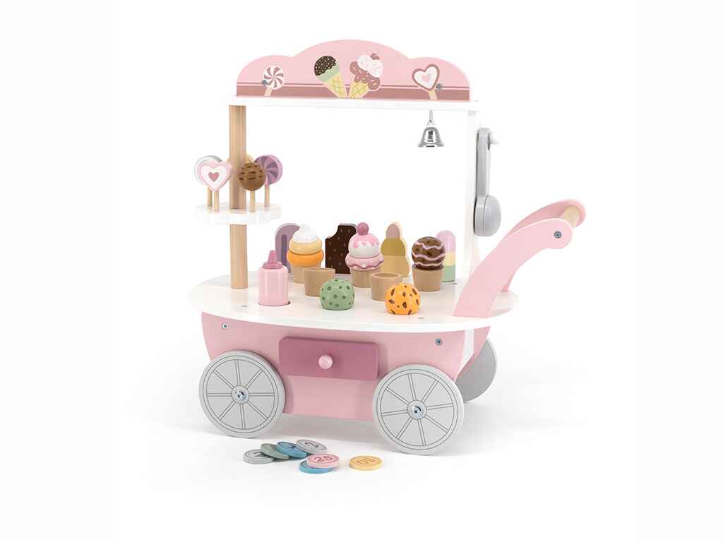 Ένα ιδιαίτερο χαρακτηριστικό του παιχνιδιού είναι η μαγνητική κουτάλα παγωτού, που επιτρέπει στα παιδιά να “πιάνουν” και να τοποθετούν την μπάλα παγωτού στο χωνάκι. Αυτό ενισχύει τις κινητικές τους δεξιότητες και τους δίνει τη δυνατότητα να δημιουργούν μοναδικούς συνδυασμούς γεύσεων. Στην πίσω πλευρά του καροτσιού υπάρχει ένα συρτάρι αποθήκευσης για κέρματα, που προσθέτει μια ρεαλιστική πινελιά στο παιχνίδι. Ένα μικρό καμπανάκι επιτρέπει στα παιδιά να προσελκύουν πελάτες, κάνοντας την εμπειρία ακόμη πιο διασκεδαστική.