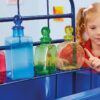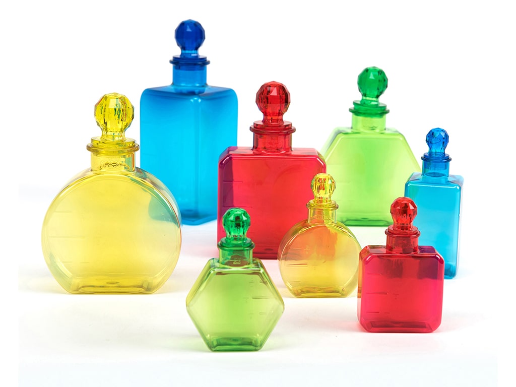 Μπουκάλια ημιδιάφανα, με έντονα χρώματα, πλαστικά με όψη γυαλιού. Τα σημάδια 1/4, 1/2 και 3/4 βοηθούν τα παιδιά να μάθουν για την χωρητικότητα και τον όγκο μέσα από το παιχνίδι. Επίσης μπορούν να χρησιμοποιηθούν και σε παιχνίδια αισθητηριακής ολοκλήρωσης. Τεμάχια 4. Διαστάσεις: 23 X 8,6 X 8,6 εκ. Ηλικία: 10 μ.+