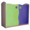 Κατασκευασμένη από συνθετικό ξύλο M.D.F. με επένδυση οξιάς. Τα πλαϊνά είναι λουστραρισμένα στο φυσικό χρώμα του ξύλου και οι πόρτες χρωματιστές. Αποτελείται από τα δύο πλαϊνά τα οποία έχουν καμπυλωτά – οβάλ τελειώματα στο πάνω μέρος και δύο πόρτες οι οποίες εσωτερικά περιλαμβάνουν τρία ράφια. Τα ντουλάπια αντί για πόμολο φέρουν στρόγγυλη χουφτίτσα διακοσμημένη με λουλούδι χαραγμένο πάνω στο ξύλο σε ηλεκτρονικό μηχάνημα ακριβείας. Η πλάτη του επίπλου (πισινό) είναι χωνευτή σε ειδικές πατούρες. Οι πόρτες του επίπλου δεν είναι ευθείες, είναι κυματιστές στο κάθετο μέρος της ένωσής τους αλλά και στο επάνω οριζόντιο μέρος όπου βγαίνει λίγο ψηλότερα από το ψηλότερο ράφι. Στο κάτω μέρος φέρει 4 πλαστικά, βιδωτά τακάκια για την προστασία των πλαϊνών της και για την εύκολη μετακίνησή της. Όλα τα άκρα είναι στρογγυλεμένα και ακίνδυνα για τα παιδιά. Τα χρώματα και τα βερνίκια που χρησιμοποιούνται είναι νερού, μη τοξικά και φιλικά προς το περιβάλλον. Διαστάσεις: 100Χ41Χ86 εκ. ύψος. Κατασκευασμένη σύμφωνα με τα πρότυπα: ΕΝ 71-1:2014, ΕΝ 71-2:2011+Α1:2014, ΕΝ 71-3:2013+Α1:2014