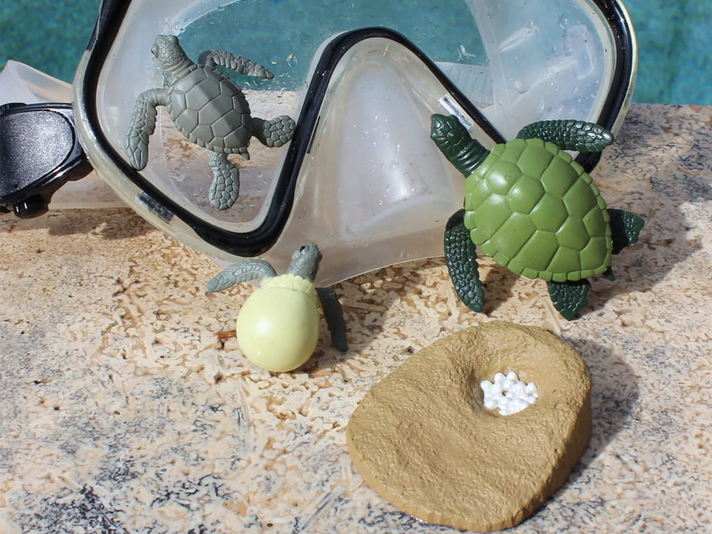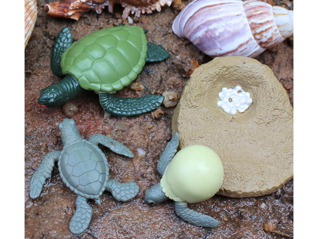 Το εκπαιδευτικό σετ «Ο κύκλος ζωής της θαλάσσιας χελώνας» επιτρέπει στα παιδιά να γνωρίσουν την απίθανη πορεία ζωής των πράσινων θαλάσσιων χελωνών. Οι χελώνες γεννιούνται από αυγά που θάβονται στην άμμο, ενώ μετά από περίπου δύο μήνες τα νεογέννητα χελωνάκια βγαίνουν στην επιφάνεια και κατευθύνονται προς τη θάλασσα, όπου θα περάσουν τη ζωή τους. Οι πράσινες χελώνες χρειάζονται πάνω από 10 χρόνια για να φτάσουν στην ενηλικίωση και μπορούν να ζήσουν έως και 100 χρόνια.