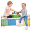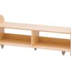 Παγκάκι-Τρόλεϊ με ράφια αποθήκευσης από βερνικωμένο κόντρα πλακέ σε φυσικό χρώμα. Εξοπλισμένο με ρόδες, ώστε ακόμη και τα μικρά παιδιά να μπορούν να το μετακινήσουν εύκολα για να τακτοποιήσουν τα μαξιλαράκια τους η τα παιχνίδια τους.