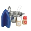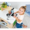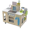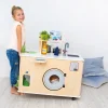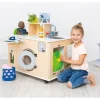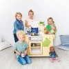 Ξύλινος πάγκος νοικοκυργιού με 4 διαφορετικά θέματα. Κατάλληλος για παιχνίδια ρόλων και φαντασίας, απαραίτητα για την ανάπτυξη των παιδιών. Ιδανικός για νηπιαγωγεία. Η κάθε του πλευρά έχει κάτι διαφορετικό για να ανακαλύψουν τα παιδιά. Αποτελείται από, γωνιά μαγειρέματος με εστίες και φούρνο και υπέροχες κάρτες συνταγών, πτυσσόμενο παιδικό καρεκλάκι, γωνία σιδερώματος και πλυσίματος με σίδερο και συρόμενη σιδερώστρα, νεροχύτη, κάδο σκουπιδιών και αποθηκευτικούς χώρους για να είναι τακτοποιημένα τα πράγματα. Περιλαμβάνει, 3 κάρτες συνταγών, 3 κάρτες με συμβουλές πλυντηρίου, 1 ποδιά, 1 γάντι φούρνου, 1 πετσέτα πιάτων, 1 καλάθι ρούχων, 1 σίδερο, 1 κατσαρόλα, 1 ταψί, 1 σύρμα, 1 κουτάλι, 4 πιάτα, 1 αναδευτήρα, αλάτι, πιπέρι και 2 κάδους από τσόχα.
