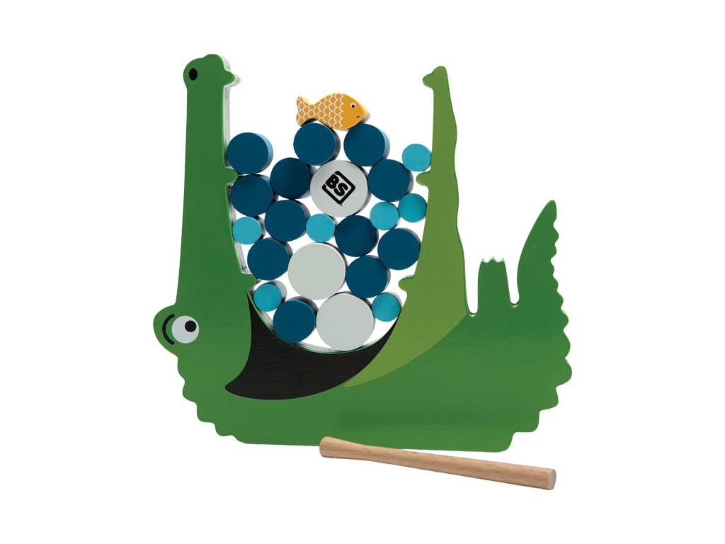 Το ξύλινο παιχνίδι ισορροπίας κροκόδειλος είναι ένα διασκεδαστικό επιτραπέζιο παιχνίδι δεξιοτήτων που βοηθά τα παιδιά να αναπτύξουν λεπτή κινητικότητα, υπομονή και συγκέντρωση μέσα από το παιχνίδι. Ο πεινασμένος κροκόδειλος περιμένει το γεύμα του και τα παιδιά πρέπει να τον βοηθήσουν να φάει τα ψάρια του, πιέζοντας προσεκτικά τα ξυλάκια από το στόμα του, χωρίς να πέσουν τα ψάρια.