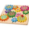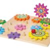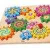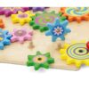 Παιχνίδι με γρανάζια. Η συναρμολόγηση των πολύχρωμων ξύλινων γραναζιών στο τραπέζι είναι η μισή διασκέδαση. Μόνο όταν ο μεγάλος μπλε τροχός μπει στη σωστή θέση γίνεται ξεκάθαρο αν το σχέδιο λειτουργεί. Διαστάσεις 30 x 30 εκατοστά.