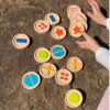 Κάθε δίσκος διαθέτει ξεχωριστό σχέδιο με αυλακώσεις και είναι βαμμένος σε ζωηρά χρώματα όπως κόκκινο, μπλε, πράσινο, κίτρινο, πορτοκαλί, ροζ και μωβ, προσελκύοντας το ενδιαφέρον των παιδιών και ενισχύοντας την οπτική αντίληψη. Το παιχνίδι λειτουργεί και ως παιχνίδι μνήμης, καθώς τα παιδιά καλούνται να βρουν τα σωστά ζευγάρια, αναπτύσσοντας τη συγκέντρωση και τη μνήμη τους.