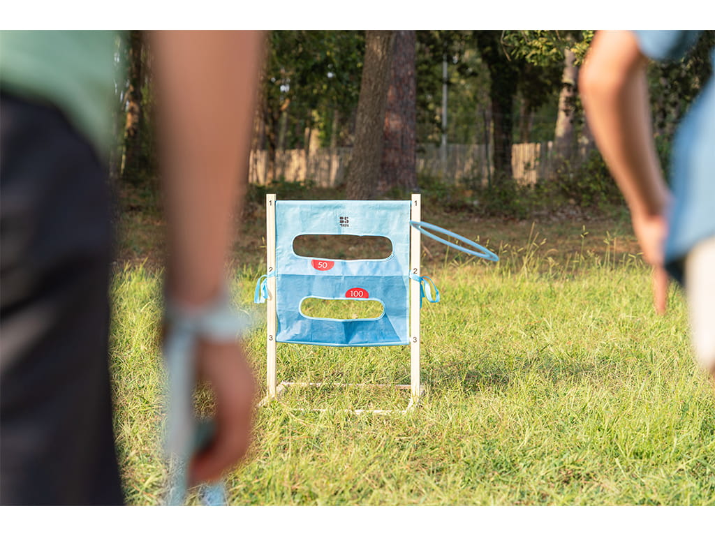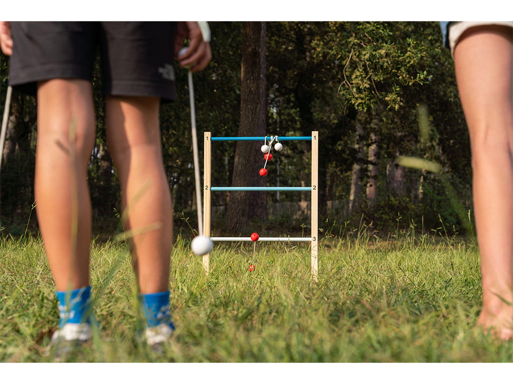 Το ξύλινο παιχνίδι στόχου 2 σε 1 με μπάλες και κρίκους, προσφέρει διπλή διασκέδαση και δράση για παιδιά και οικογένεια. Πρόκειται για ένα παιχνίδι εξωτερικού χώρου που συνδυάζει δύο διαφορετικούς τρόπους παιχνιδιού. Τα παιδιά μπορούν να ρίχνουν τις μπάλες στα επίπεδα της σκάλας προσπαθώντας να πετύχουν το καλύτερο σκορ ή να τοποθετήσουν το υφασμάτινο στόχο και να ρίχνουν τους δίσκους μέσα από τις τρύπες.
