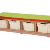 Κατασκευασμένο από συνθετικό ξύλο M.D.F. 17 χιλιοστά με επένδυση οξιάς, λουστραρισμένο στο φυσικό χρώμα του ξύλου. Στο κάτω μέρος έχει τέσσερις ξεχωριστές θέσεις μέσα στις οποίες τοποθετούνται 4 πλαστικά κουτιά αποθήκευσης παιχνιδιών (βαρέως τύπου τα οποία έχουν την δυνατότητα να στοιβάζονται όταν είναι εκτός παιχνιδοθήκης). Στο κάθισμα φέρει μαξιλάρι αφρώδες, επενδυμένο με ύφασμα υψηλής ποιότητας και αντοχής ή δερματίνη. Όλα τα άκρα είναι στρογγυλεμένα και ακίνδυνα για τα παιδιά. Τα καλύμματα των μαξιλαριών βγαίνουν σε όλα τα χρώματα. Χρώματα παιχνιδόκουτων: κόκκινο, πράσινο, κίτρινο, μπλε και διάφανα: κίτρινο, καρπουζί, βεραμάν, μωβ και γαλάζιο. Διαστάσεις: 143 x 47 x 38 εκατοστά. Ύψος καθίσματος: 38 εκατοστά. Κατασκευάσμενο σύμφωνα με τα πρότυπα: ΕΝ 71-1:2014 ΕΝ 71-2:2011+Α1:2014 ΕΝ 71-3:2013+Α1:2014 και συνοδεύεται απο Έκθεση δοκιμών.