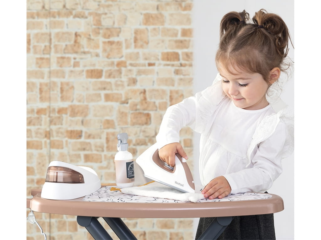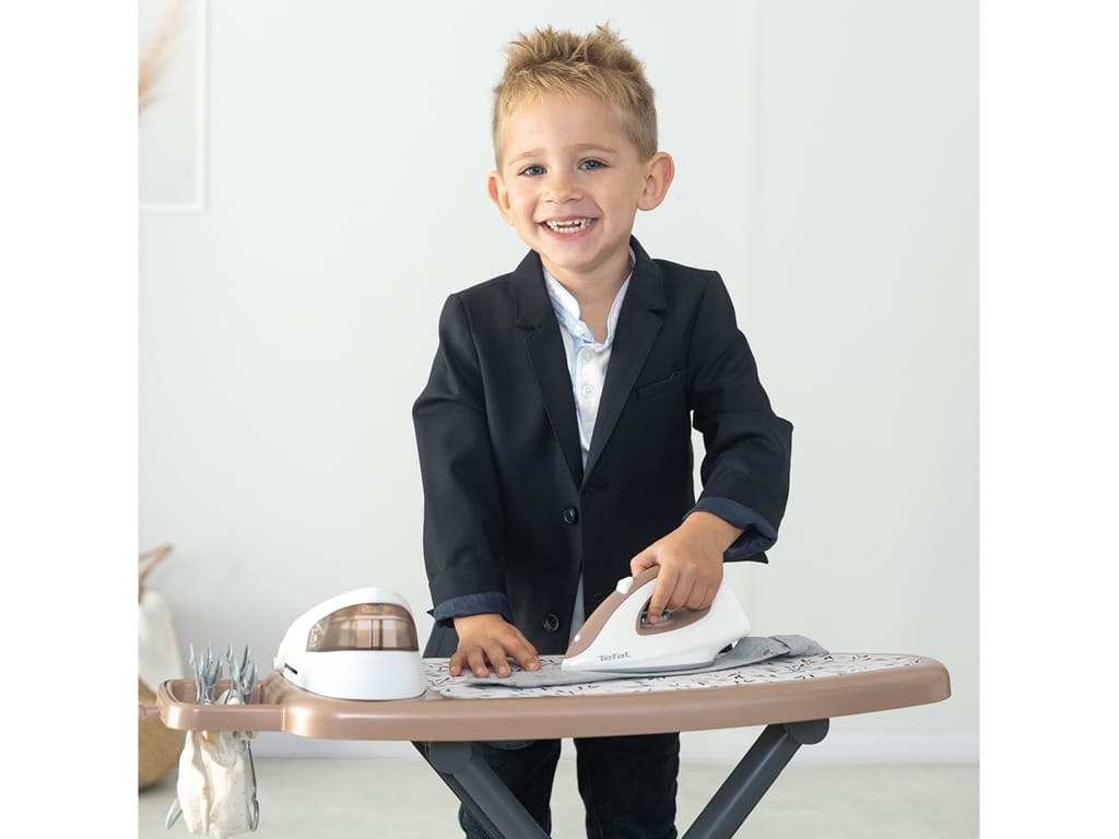Με το παιδικό συστήμα σιδερώματος tefal, τα παιδιά μπορούν να μιμηθούν τη μαμά και τον μπαμπά και να «σιδερώσουν» τα δικά τους ρούχα μέσα από ένα διασκεδαστικό παιχνίδι ρόλων. Το σετ διαθέτει μεγάλη σιδερώστρα και σίδερο με γεννήτρια ατμού, εξοπλισμένο με κουμπιά που παράγουν ήχους “κλικ-κλικ”, κάνοντας το παιχνίδι ακόμη πιο ρεαλιστικό