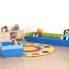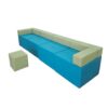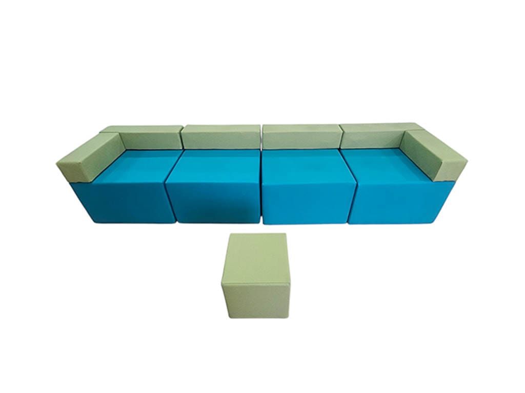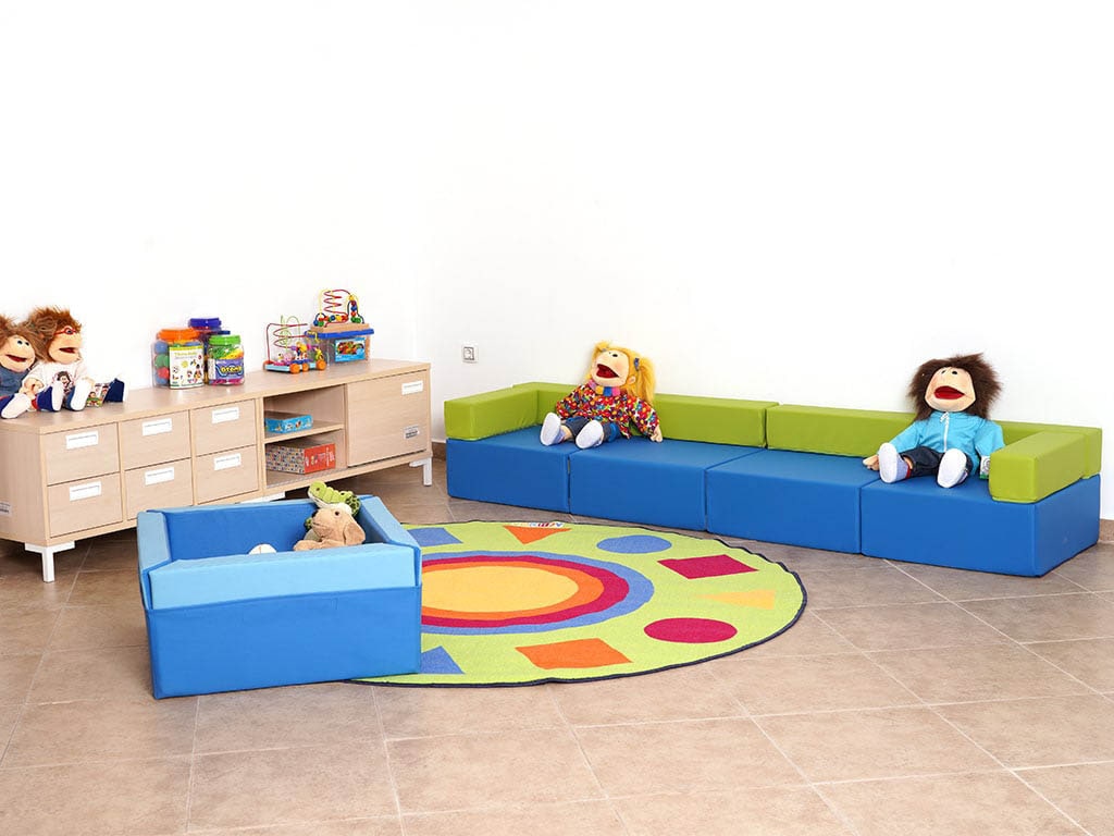 Τοποθετείται σε ευθεία ή γωνία διάταξη. Τα κομμάτια ενώνονται μεταξύ τους με velcro για να μένουν σταθερά. Κομμάτι γωνιακό: 60 x 60 x 40 εκ. Ύψος καθίσματος: 25 εκ.