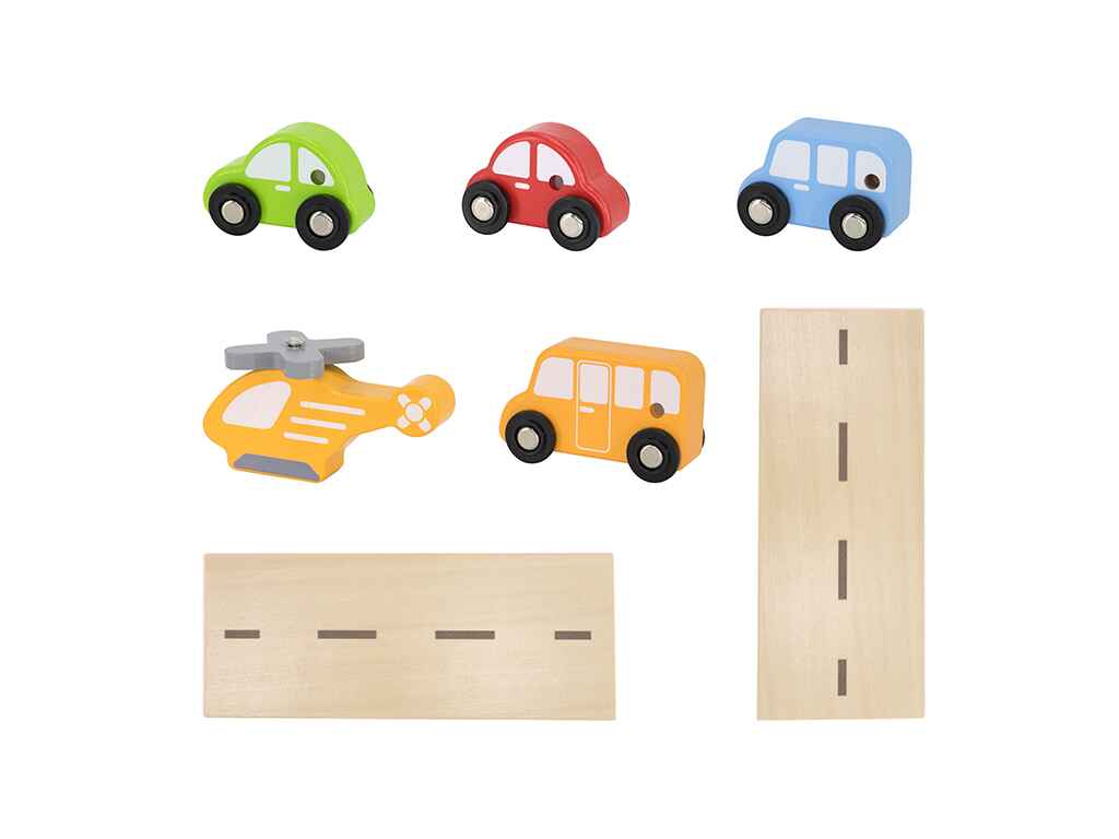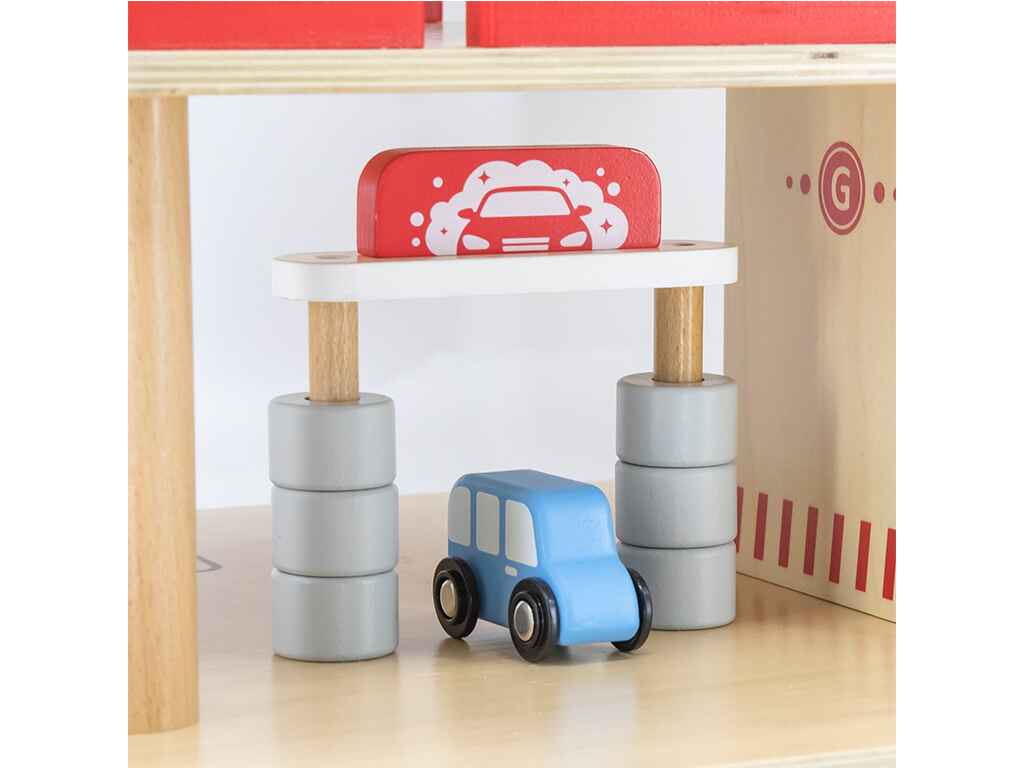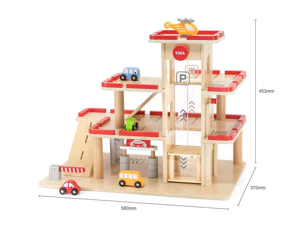 Το σετ περιλαμβάνει ένα ανθεκτικό ξύλινο πάρκινγκ, 4 αυτοκίνητα και ένα ελικόπτερο, προσφέροντας μια ολοκληρωμένη εμπειρία παιχνιδιού. Τα παιδιά μπορούν να αντλήσουν καύσιμα, να πλύνουν το αυτοκίνητό τους, να χρησιμοποιήσουν τον ανελκυστήρα και να προσγειώσουν το ελικόπτερο, αναπτύσσοντας τη φαντασία τους μέσα από ρεαλιστικά σενάρια.