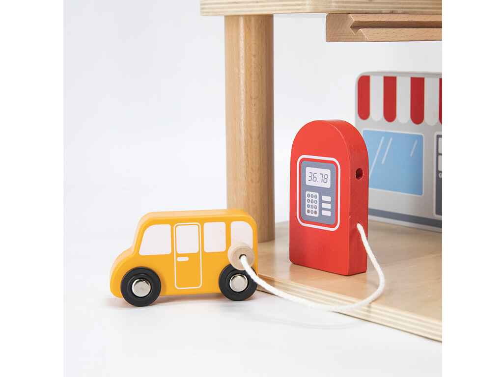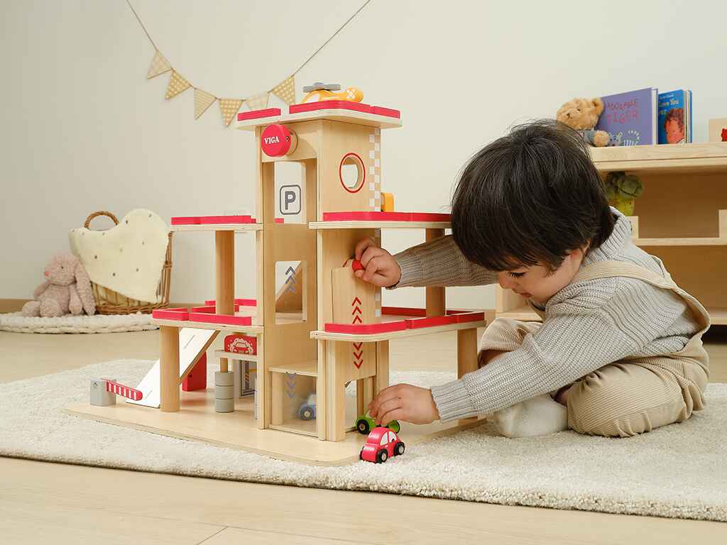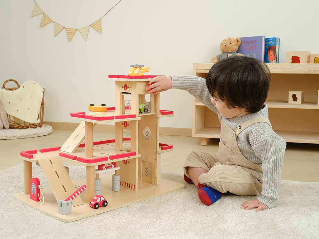 Ιδανικό για παιχνίδια ρόλων, το ξύλινο πάρκινγκ γκαράζ δίνει στα παιδιά την ευκαιρία να υποδυθούν διαφορετικούς ρόλους, όπως οδηγός, μηχανικός ή υπάλληλος σε σταθμό εξυπηρέτησης, ενισχύοντας τη φαντασία, την επικοινωνία και την κοινωνική αλληλεπίδραση.