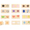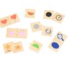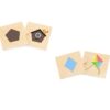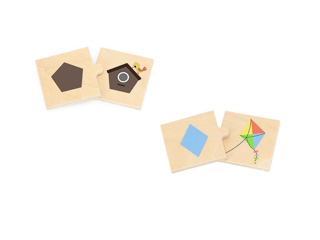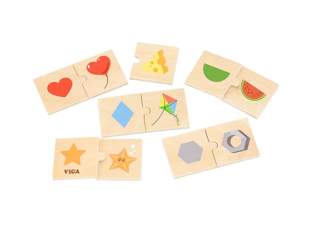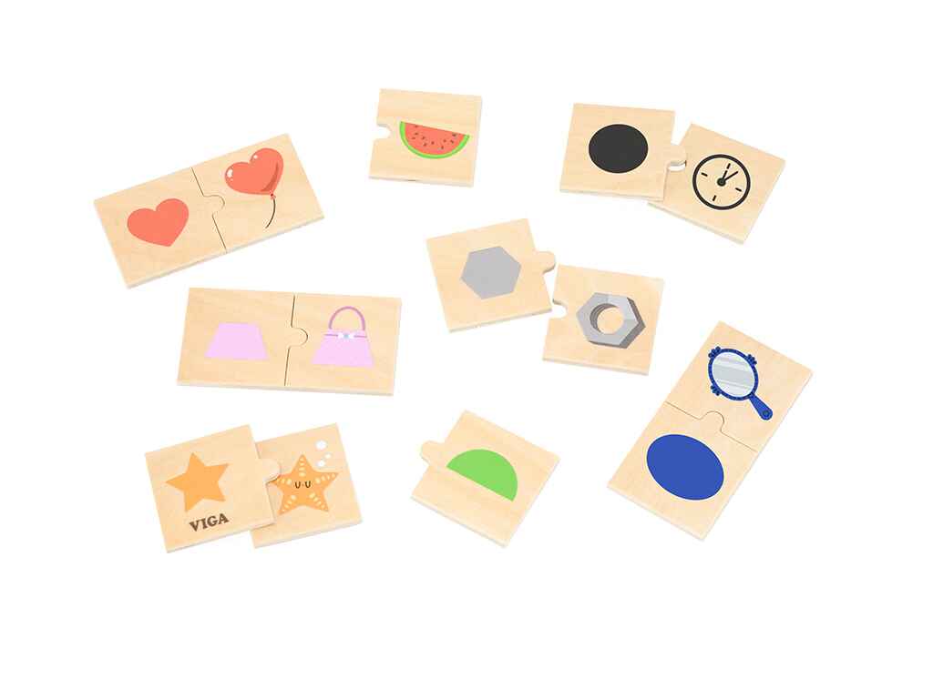 Το ξύλινο σετ παζλ με αντιστοιχίες σχημάτων είναι ένα διασκεδαστικό και εκπαιδευτικό παιχνίδι που βοηθά τα παιδιά να αναγνωρίζουν βασικά γεωμετρικά σχήματα και να τα συνδέουν με γνώριμα αντικείμενα της καθημερινής ζωής. Το σετ περιλαμβάνει 24 παζλ, καθένα από τα οποία αποτελείται από 2 κομμάτια που ταιριάζουν μεταξύ τους. Μέσα από το παιχνίδι, τα παιδιά ανακαλύπτουν αντιστοιχίες, όπως το αστέρι με τον αστερία, τον κύκλο με το ρολόι και τον ρόμβο με τον χαρταετό, αναπτύσσοντας έτσι τη συνδυαστική τους σκέψη.