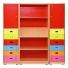 Κατασκευασμένη από συνθετικό ξύλο M.D.F. με επένδυση οξιάς, λουστραρισμένη στο φυσικό χρώμα του ξύλου ο σκελετός και σε διάφορους χρωματικούς συνδυασμούς τα συρτάρια, τα ντουλάπια και η πλάτη. Περιλαμβάνει 12 συρτάρια και 2 ντουλάπια διακοσμημένα με λουκάκι, αναγνωστήριο, ράφια και σκεπή προαιρετικά. Όλα τα άκρα είναι στρογγυλεμένα και ακίνδυνα για τα παιδιά. Τα χρώματα και τα βερνίκια που χρησιμοποιούνται είναι νερού, μη τοξικά και φιλικά προς το περιβάλλον. Διαστάσεις: 155Χ40Χ150 εκ.