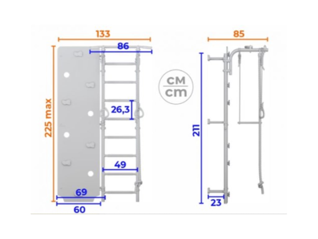 - Μέγιστο φορτίο: 100 kg (σκάλα & μπάρα έλξεων) / 50 kg (αξεσουάρ)