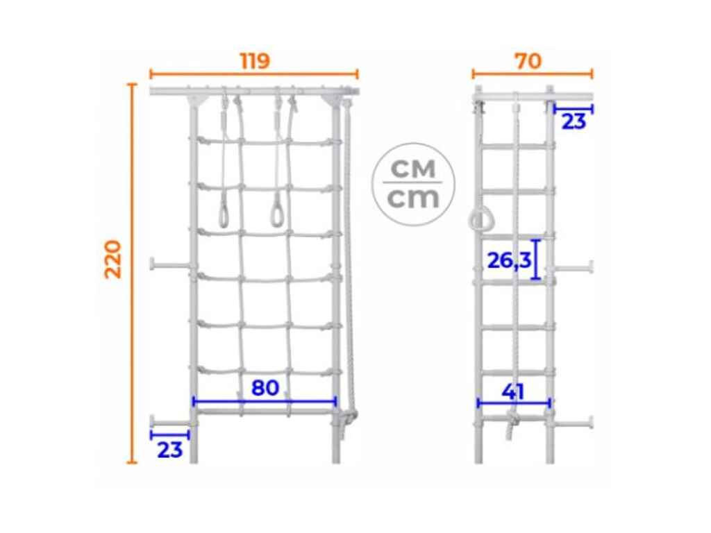 Η εύκολη εγκατάσταση επιτρέπει τη μετακίνηση του εξοπλισμού σε διαφορετικά μέρη του χώρου, ενώ η τοποθέτηση του διχτυού αναρρίχησης μπορεί να γίνει τόσο στην δεξιά όσο και στην αριστερή πλευρά του σετ. Το πολύζυγο είναι σχεδιασμένο για παιδιά από 3 ετών και άνω, με μέγιστο φορτίο 100 kg για το ίδιο το πολύζυγο και 50 kg για τα αξεσουάρ. Η εγκατάσταση του σε τοίχο είναι γρήγορη και δεν απαιτεί τρύπημα του τοίχου, κάνοντάς το ιδανικό για σπίτια και διαμερίσματα με περιορισμένο χώρο.