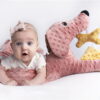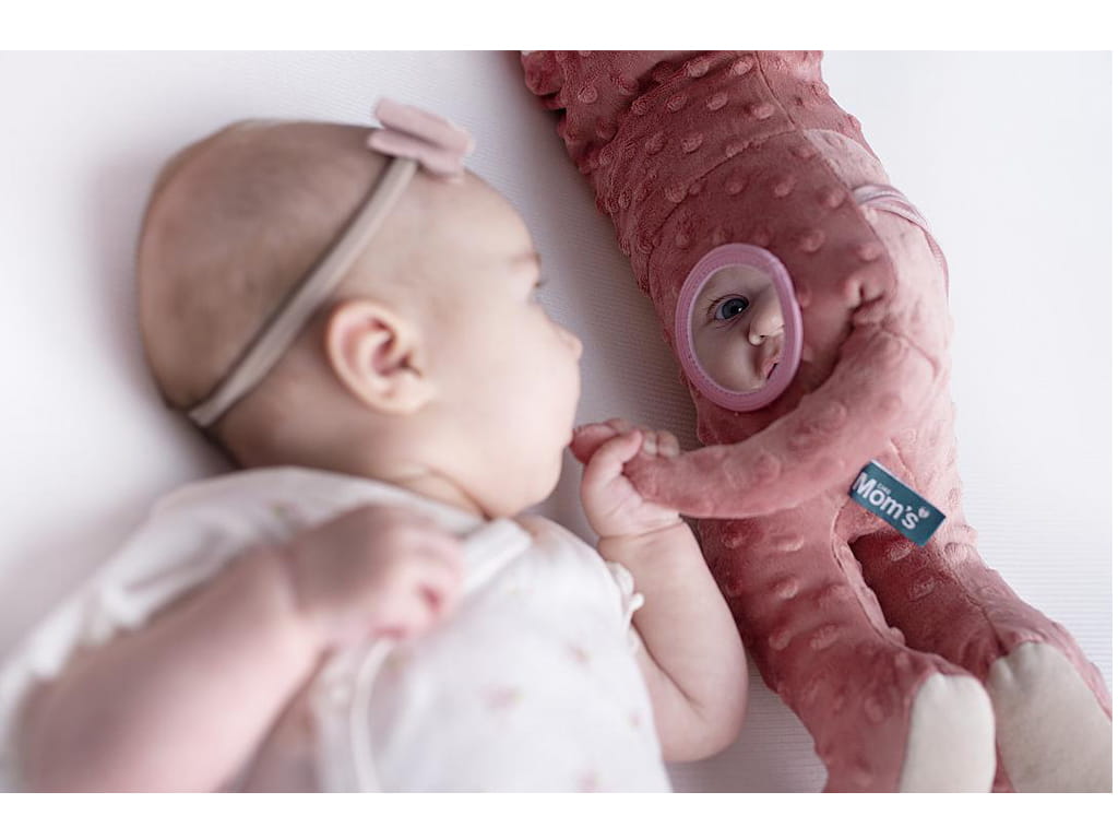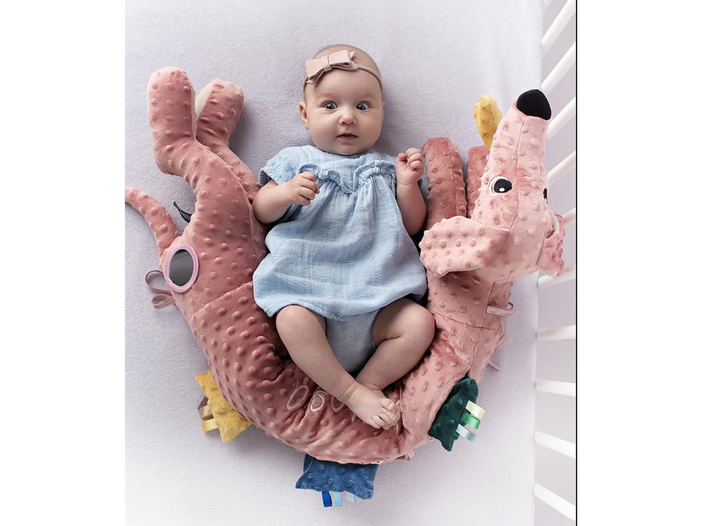 Με τις ραμμένες κορδέλες μπορεί να στερεωθεί σε κάθε τύπο κούνιας, λειτουργώντας ως προστατευτικό και μαξιλάρι. Οι αισθητηριακές τσέπες με διαφορετικά γεμίσματα, ενισχύουν την αίσθηση της αφής, την ακουστική αντίληψη και την παρατήρηση. Τα σπιρτόζικα αυτιά, η παιχνιδιάρικη ουρά και το καθρεφτάκι στο σώμα του προσφέρουν ατελείωτες ώρες διαδραστικού παιχνιδιού και εξερεύνησης.