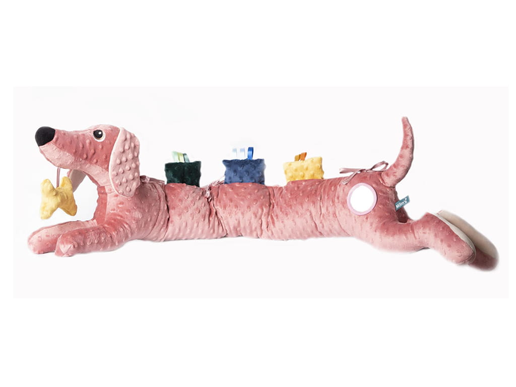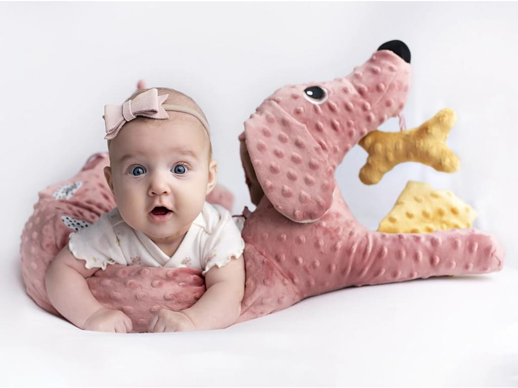 Το σκυλάκι μπορεί επίσης να χρησιμοποιηθεί για να στηρίζει το μωρό όταν βρίσκεται μπρούμυτα, βοηθώντας το να δυναμώσει τον αυχένα και να μάθει να σηκώνει το κεφάλι του. Ακόμα, μπορεί να γίνει εργαλείο μάθησης των πρώτων λέξεων μέσα από παιχνίδι, όπως πατούσα, μάτι, αυτί. Κατασκευασμένο από ασφαλή υλικά, με πιστοποίηση CE και σύμφωνα με το πρότυπο ασφαλείας EN 71, είναι κατάλληλο για μωρά από 0 μηνών, εύκολο στο καθάρισμα και ιδανικό για καθημερινή χρήση.