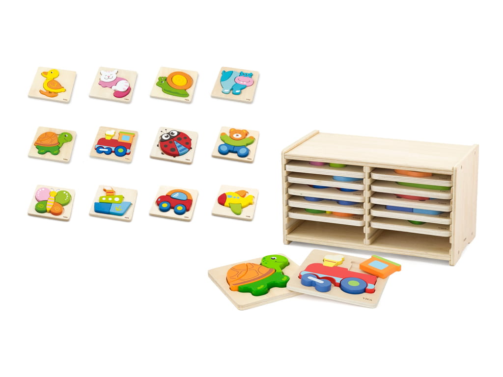 Η Ξύλινη Ραφιέρα Αποθήκευσης για 12 Παζλ είναι ένα πρακτικό και ανθεκτικό αξεσουάρ για τα παιχνίδια του παιδιού. Ιδανική για οργάνωση έως 12 παζλ, βοηθά τα παιδιά να μαθαίνουν να τακτοποιούν τα παιχνίδια τους με ευκολία και τάξη.