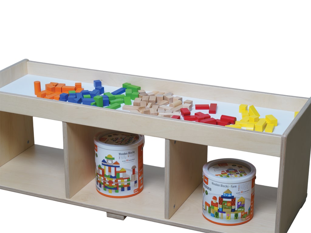 Διαθέτει τρία ανοιχτά ράφια, ιδανικά για την τακτοποίηση εκπαιδευτικού υλικού, βιβλίων ή παιχνιδιών σε εμφανές και προσβάσιμο σημείο, ενώ στην κορυφή της περιλαμβάνει επιφάνεια παιχνιδιού με βάθος 5,5 εκ., προσφέροντας έναν οριοθετημένο και πρακτικό χώρο για δραστηριότητες, χωρίς τον κίνδυνο τα αντικείμενα να πέφτουν.