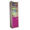 Κατασκευασμένη από συνθετικό ξύλο M.D.F. με επένδυση οξιάς λουστραρισμένη στο φυσικό χρώμα του ξύλου τα πλαϊνά και τα ράφια της και χρωματιστά το πορτάκι και η πλάτη. Αποτελείται από τα δύο πλαϊνά τα οποία έχουν καμπυλωτά – οβάλ τελειώματα στο πάνω μέρος, ντουλάπι στο κάτω μέρος και τρία ράφια στο πάνω μέρος. Το ντουλαπάκι αντί για πόμολο φέρει στρόγγυλη χουφτίτσα διακοσμημένη με λουλούδι χαραγμένο πάνω στο ξύλο σε ηλεκτρονικό μηχάνημα ακριβείας. Η πλάτη του επίπλου (πισινό) είναι χωνευτή σε ειδικές πατούρες. Το ντουλαπάκι του επίπλου δεν είναι ίσιο, αλλά κυματιστό στο επάνω οριζόντιο μέρος όπου βγαίνει λίγο ψηλότερα από το ράφι. Στο κάτω μέρος φέρει 4 πλαστικά, βιδωτά τακάκια για την προστασία των πλαϊνών της και για την εύκολη μετακίνησή της. Όλα τα άκρα είναι στρογγυλεμένα και ακίνδυνα για τα παιδιά. Τα χρώματα και τα βερνίκια που χρησιμοποιούνται είναι νερού, μη τοξικά και φιλικά προς το περιβάλλον. Διαστάσεις: 51Χ41Χ190 εκ. ύψος. Κατασκευασμένη σύμφωνα με τα πρότυπα: ΕΝ 71-1:2014, ΕΝ 71-2:2011+Α1:2014, ΕΝ 71-3:2013+Α1:2014