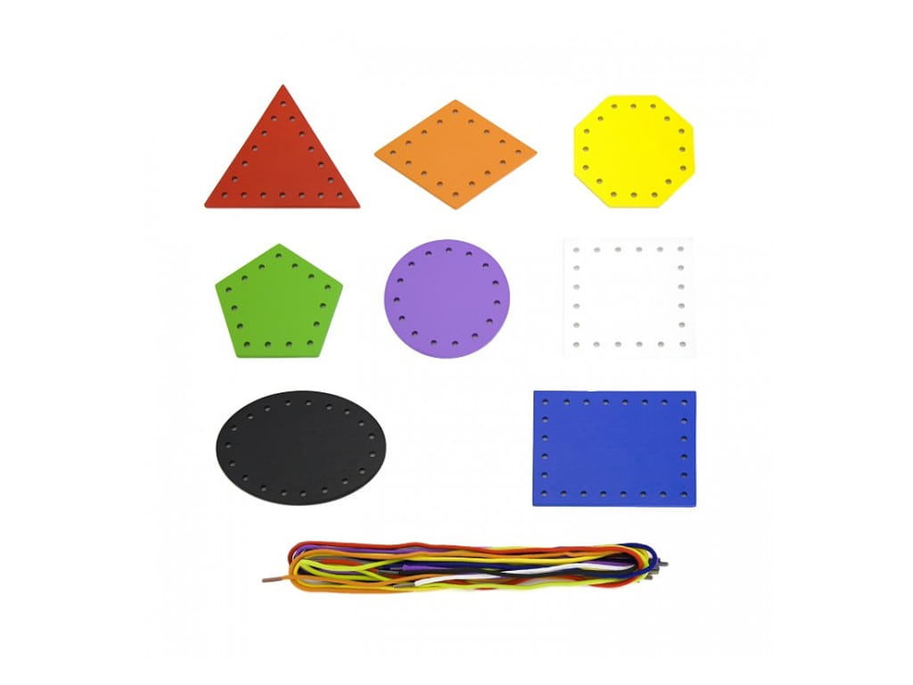 Τα σχήματα για ράψιμο είναι ένα διασκεδαστικό και εκπαιδευτικό παιχνίδι που ενισχύει τη λεπτή κινητικότητα και τον συντονισμό χεριού-ματιού των παιδιών. Το σετ περιλαμβάνει 8 χρωματιστά ξύλινα γεωμετρικά σχήματα, τα οποία τα παιδιά μπορούν να “ράψουν” χρησιμοποιώντας τα ξυλάκια με κορδόνια με ειδικά μυτερά άκρα, ιδανικά για μικρά χεράκια.
