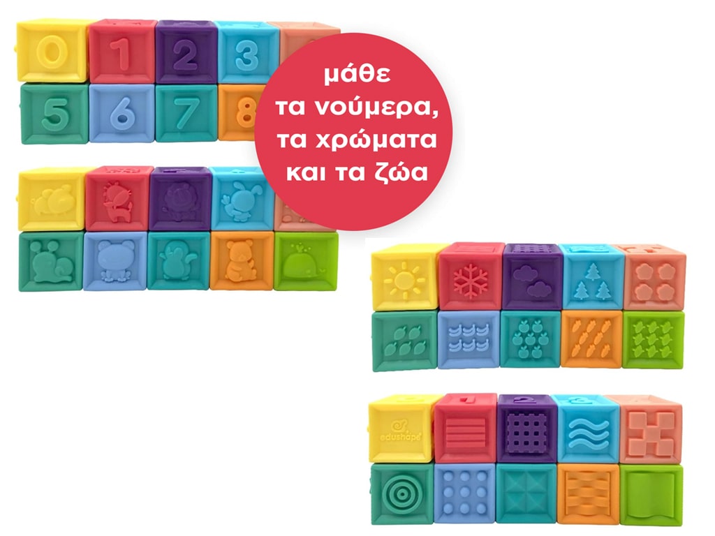 Κάθε κύβος διαθέτει διαφορετικά σχέδια στις πλευρές του, προσφέροντας πολυδιάστατη εκπαιδευτική εμπειρία. Περιλαμβάνονται αριθμοί, οι οποίοι βοηθούν τα παιδιά να εξοικειωθούν με την αρίθμηση, σχήματα – ενσφηνώματα, καθώς και ζωάκια που διεγείρουν τη φαντασία τους. Οι κύβοι έχουν επίσης διαφορετικές υφές σε κάθε πλευρά, οι οποίες συμβάλλουν στην ανάπτυξη της αφής, ενώ τα ζωντανά χρώματα τραβούν την προσοχή των παιδιών, προάγοντας την οπτική αντίληψη.