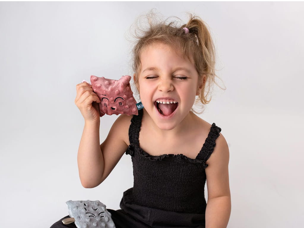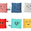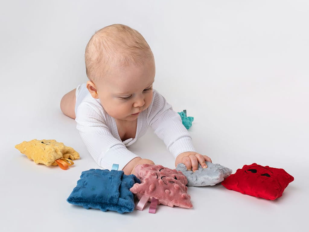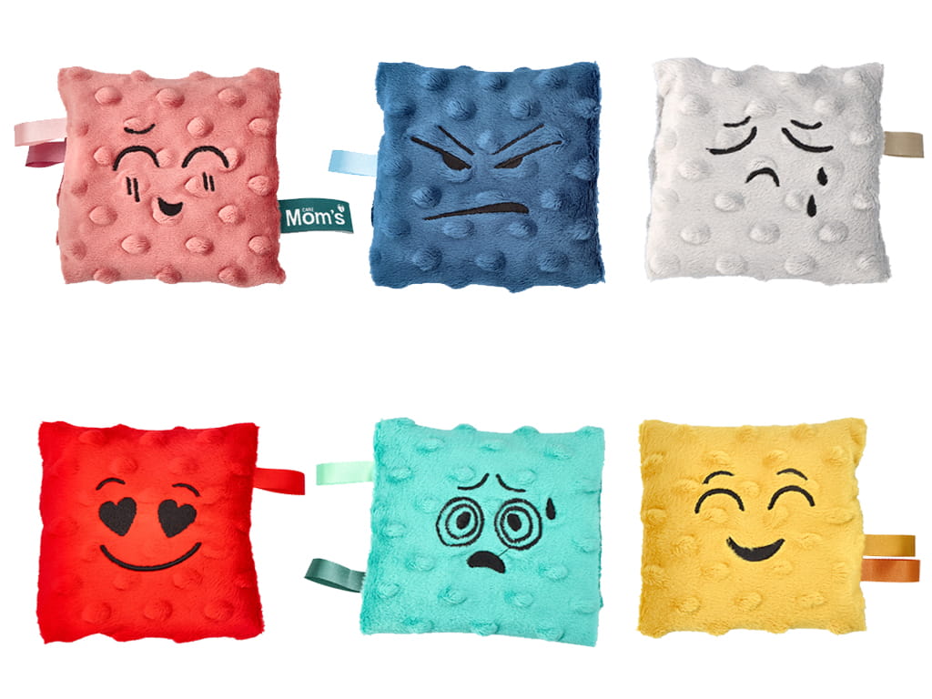 Το σετ περιλαμβάνει 6 μαλακά σακουλάκια, το καθένα με διαφορετικό χρώμα, συναίσθημα και φυσικό γέμισμα. Τα υλικά που χρησιμοποιούνται όπως φαγόπυρο με λεβάντα, μπιζέλια, ρύζι, κεχρί, λιναρόσπορος και κουκούτσια κερασιού προσφέρουν ποικιλία υφών και βάρους, ενισχύοντας την αισθητηριακή εμπειρία. Το απαλό βελουτέ ύφασμα minky και οι πολύχρωμες κορδελίτσες τραβούν την προσοχή του παιδιού και ενθαρρύνουν το πιάσιμο και την εξερεύνηση.