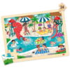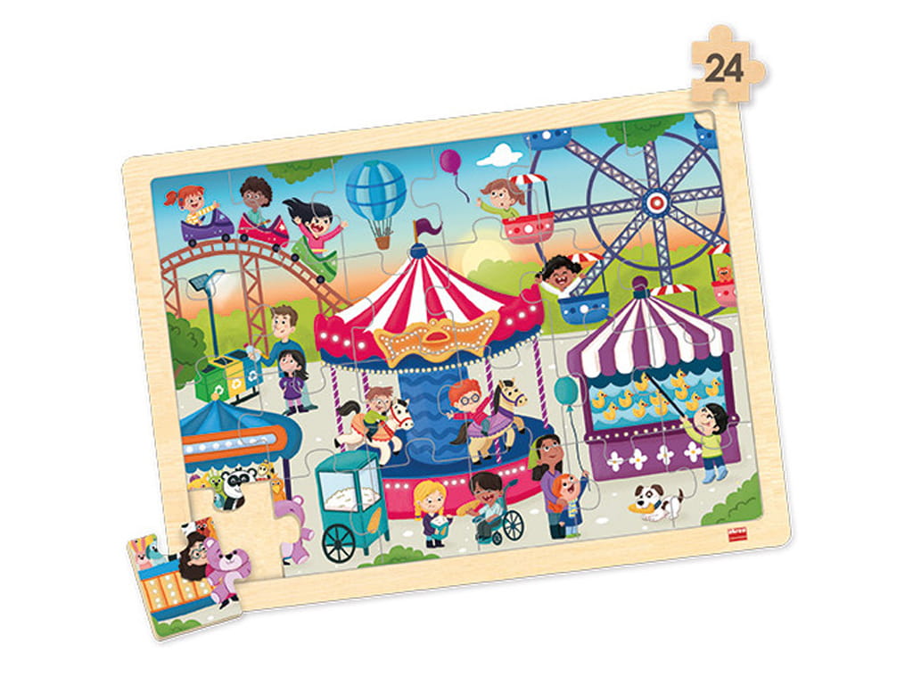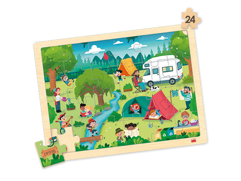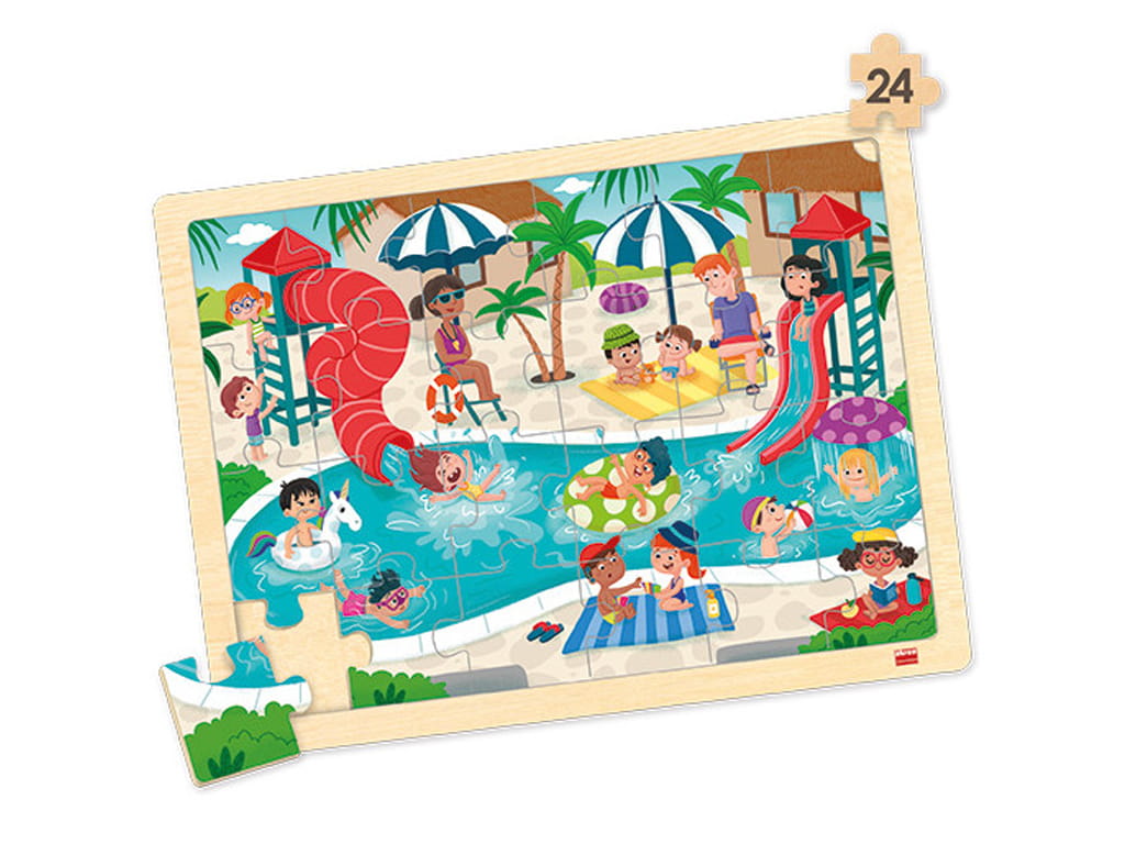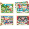 Το σετ παζλ κοινωνικής ζωής περιλαμβάνει 4 παζλ υψηλής ποιότητας με 24 κομμάτια το καθένα, κατασκευασμένα από βιώσιμο ξύλο και συνοδευόμενα από 4 αντίστοιχες αφίσες. Τα παζλ απεικονίζουν σκηνές από το κάμπινγκ, τσίρκο, πισίνα και λούνα πάρκ, δημιουργώντας διασκεδαστικές και εκπαιδευτικές εμπειρίες για τα παιδιά.