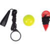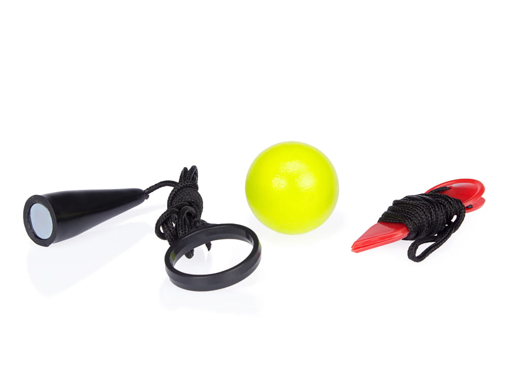 Το σετ περιλαμβάνει ξύλινη μπάλα στόχου διαμέτρου 28 χιλ., κορδόνι (μεζούρα) 98 εκ. και μαγνήτη με κορδόνι 93 εκ., για εύκολη μέτρηση και χειρισμό. Όλα τα αξεσουάρ κατασκευάζονται από ανθεκτικά και ασφαλή υλικά, ώστε να είναι κατάλληλα για παιχνίδι με παιδιά και ενήλικες.