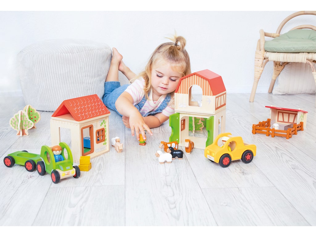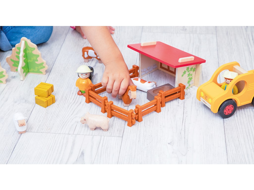 Σετ φάρμας μινιατούρες, ιδανικές για τα μικρά χεράκια. Τα παιδιά θα ανακαλύψουν τη ζωή στην εξοχή φτιάχνοντας τη δική τους φάρμα με αυτό το σετ που περιλαμβάνει αχυρώνα, στάβλο, τρακτέρ, αγροτικό, σπίτι για την οικογένεια, πρόβατο, αγελάδα, άλογο, κοτόπουλα κ.α.