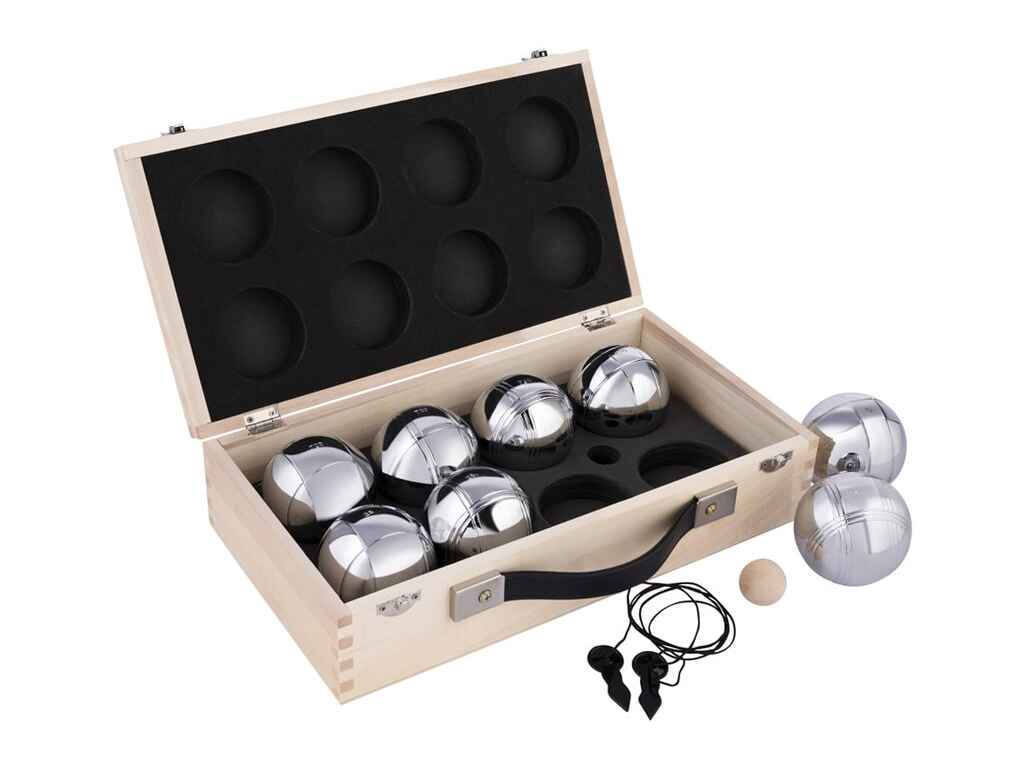 Το σετ περιλαμβάνει 8 μεταλλικές μπάλες, 1 ξύλινη μπάλα στόχου, μεζούρα για ακριβή μέτρηση αποστάσεων και κανόνες παιχνιδιού. Όλα είναι προσεκτικά τοποθετημένα σε πολυτελή ξύλινη θήκη, που προσφέρει ασφαλή αποθήκευση, εύκολη μεταφορά και κομψή παρουσίαση.