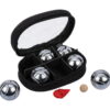 Το σετ περιλαμβάνει 6 μίνι χρωμιωμένες μεταλλικές μπάλες από ανθεκτικό χάλυβα με δύο διαφορετικά σχέδια γραμμών, ώστε κάθε παίκτης να αναγνωρίζει εύκολα τη δική του μπάλα. Επιπλέον, περιλαμβάνεται μικρή ξύλινη μπάλα στόχος, κορδόνι 98 εκ. και πρακτική πολυεστερική θήκη με διαχωριστικά, για εύκολη μεταφορά και αποθήκευση.