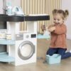 Το σετ νοικοκυριού είναι κατασκευασμένο από πλαστικό υψηλής ποιότητας, εξαιρετικά ανθεκτικό και ασφαλές για χρήση από παιδιά. Το σετ προσφέρει μια ρεαλιστική εμπειρία, δίνοντας στα παιδιά την ευκαιρία να μιμηθούν τις δραστηριότητες των ενηλίκων στο σπίτι με ασφάλεια και διασκέδαση. Περιλαμβάνει διάφορα αντικείμενα που ενισχύουν τη δημιουργικότητα και την ανάπτυξη δεξιοτήτων, όπως ένα πλυντήριο, ένα σίδερο, φαρμακευτικά προϊόντα για το πλυντήριο, 2 κρεμάστρες για τα ρούχα, σαπούνι για τα χέρια, και μανταλάκια για την απλόστρα, προσφέροντας πλήρη εμπειρία νοικοκυριού. Το σετ περιέχει επίσης μία απλόστρα, η οποία συνδέεται με το πλυντήριο ρούχων για να προσφέρει μια πρακτική λύση για την αποθήκευση και το στέγνωμα των ρούχων. Αυτό κάνει την εμπειρία ακόμα πιο οργανωμένη και ευχάριστη, ενισχύοντας τη διασκέδαση του παιδιού και την ανάπτυξή του μέσω παιχνιδιού που μιμείται τις καθημερινές δραστηριότητες στο σπίτι.
