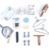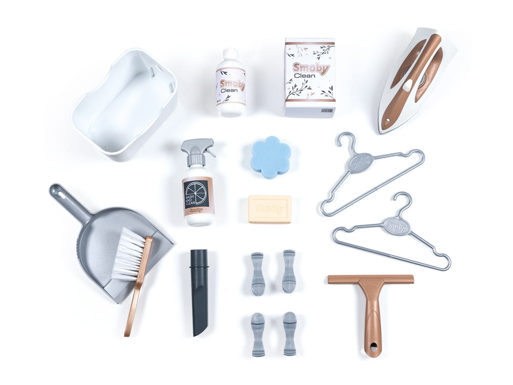Το σετ συνοδεύεται από 17 αξεσουάρ, που περιλαμβάνουν, μπουκάλι ψεκασμού, σαπούνι, σφουγγάρι, σκούπα με ηλεκτρονικό ήχο, σίδερο, 4 μανταλάκια, 2 κρεμάστρες, καλάθι ρούχων, καθαριστήρας τζαμιών και εναλλάξιμο ακροφύσιο για τη σκούπα. Αυτά τα αξεσουάρ ενισχύουν το παιχνίδι ρόλων και επιτρέπουν στα παιδιά να δημιουργήσουν ρεαλιστικές σκηνές νοικοκυριού, ενώ μαθαίνουν με διασκεδαστικό τρόπο τις καθημερινές εργασίες.