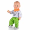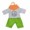 Σετ ρούχων κούκλας 3 τεμαχίων. Αποτελείται από 1 μπλούζα, 1 παντελόνι ι και 1 μαντήλι. Με ελαστική ζώνη και κούμπωμα με βέλκρο. Έρχεται σε ξύλινη κρεμάστρα. Για κούκλες με ύψος 35-45 εκ. Ύφασμα: μπλούζα: 70% πολυεστέρας, 30% βαμβάκι, παντελόνι και μαντήλι: 100% βαμβάκι.