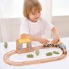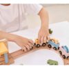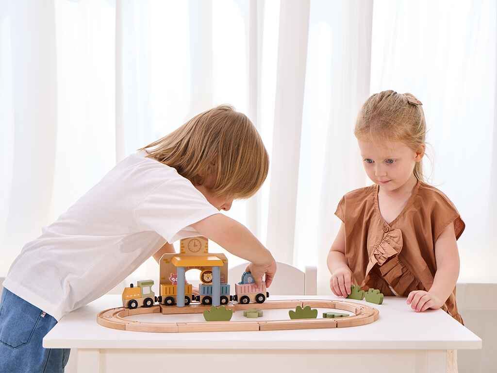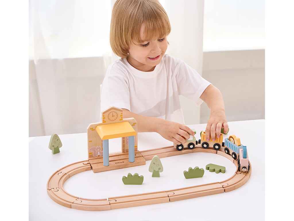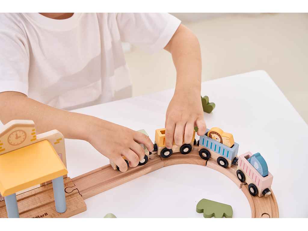 Το παιχνίδι με τον ξύλινο σιδηρόδρομο βοηθά τα παιδιά να αναπτύξουν τη λεπτή κινητικότητα και τον συντονισμό χεριού-ματιού, καθώς πιάνουν, συνδέουν και τοποθετούν τα βαγόνια και τα ζωάκια. Επίσης μέσα από το ελεύθερο παιχνίδι, τα παιδιά ενισχύουν τη φαντασία και τη δημιουργικότητά τους. Επιπλέον η συναρμολόγηση και η οργάνωση των στοιχείων του σιδηροδρόμου ενισχύουν την ικανότητα επίλυσης προβλημάτων, τη λογική σκέψη και την αντίληψη του χώρου.