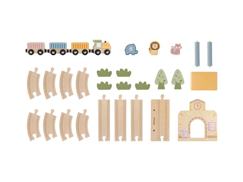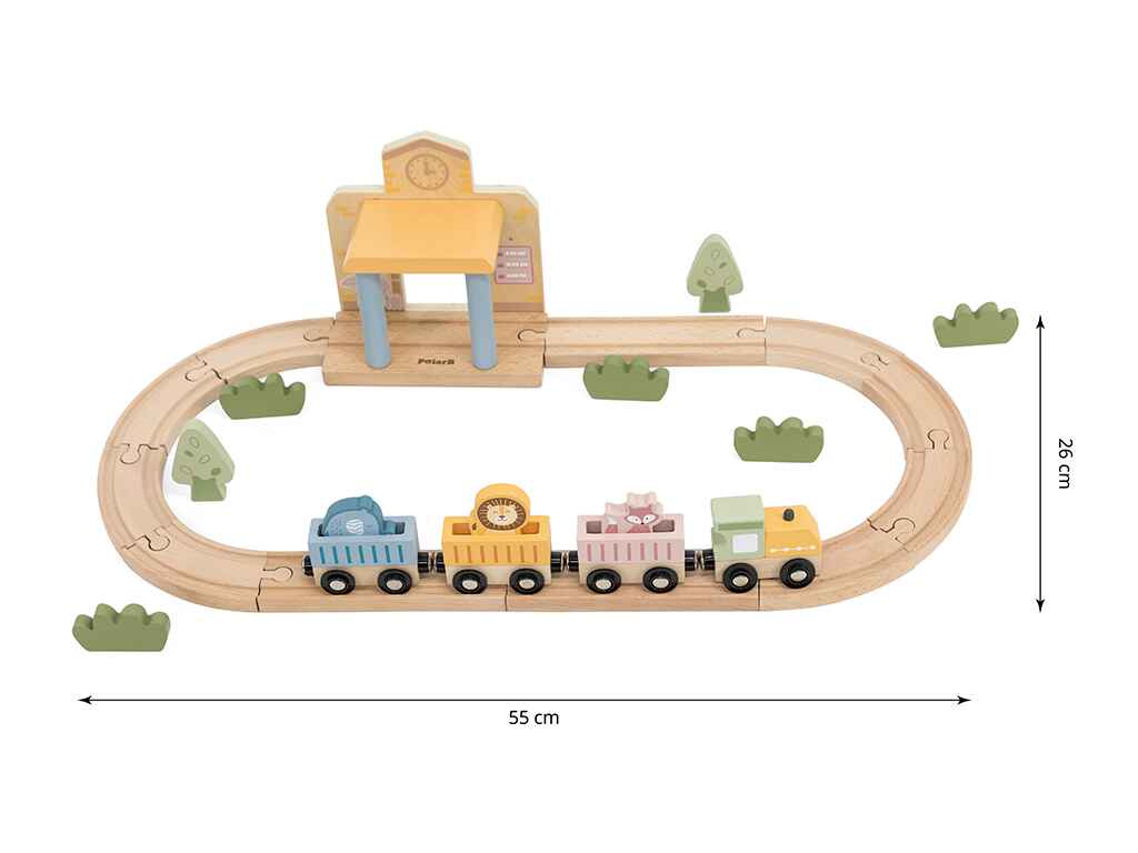 Το ξύλινο σιδηροδρομικό δίκτυο 30 τεμαχίων προσφέρει στα παιδιά μια μοναδική εμπειρία παιχνιδιού, συνδυάζοντας τη διασκέδαση με τη μάθηση. Το σετ περιλαμβάνει έναν κυκλικό σιδηρόδρομο διαστάσεων 55 x 26 εκ., έναν όμορφο σταθμό με ρολόι, πρόγραμμα δρομολογίων και σκέπαστρο, καθώς και ένα τρένο με τρία μαγνητικά συνδεδεμένα βαγόνια.