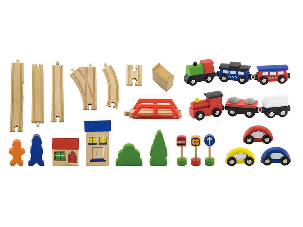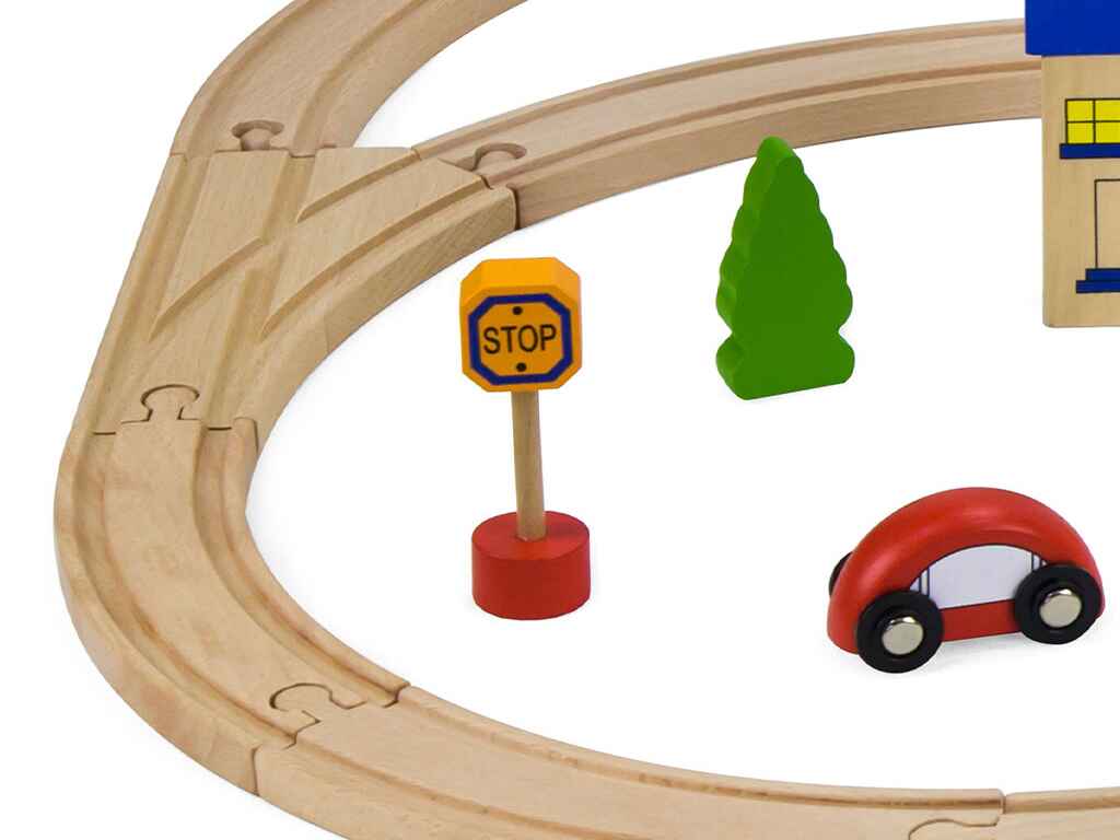 Το μικρό ξύλινο σιδηροδρομικό δίκτυο είναι ένα δημιουργικό παιχνίδι ρόλων που μετατρέπει το παιχνίδι των παιδιών σε μια μικρή πόλη γεμάτη δράση και φαντασία. Με δυνατότητα κατασκευής διαφορετικών διαδρομών τρένου, προσφέρει ατελείωτες ώρες διασκέδασης και δημιουργικής απασχόλησης.