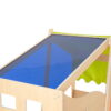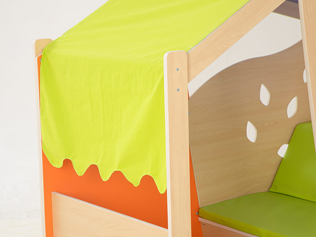 Η κατασκευή από κόντρα πλακέ με επένδυση μελαμίνης σε απόχρωση σφένδαμου, σε συνδυασμό με την ανθεκτική οροφή από πολυκαρβονικό υλικό και ύφασμα, προσφέρει αντοχή, ασφάλεια και αισθητική αρμονία στον χώρο. Τα μαλακά μαξιλάρια καθίσματος εξασφαλίζουν άνεση, δημιουργώντας ένα φιλόξενο σημείο για τα παιδιά.